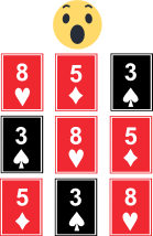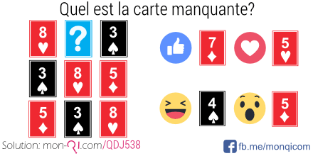 La carte qui complète cette figure est le 5 de carreau. En effet, nous avons trois cartes identiques et alignées différemment sur chaque ligne.