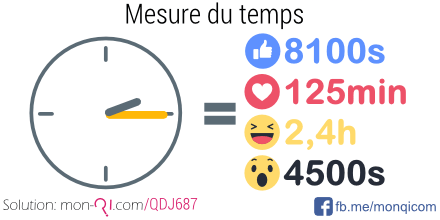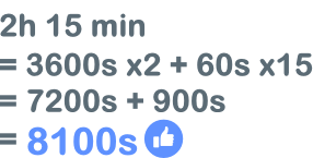 Sachant qu'une heure est égale à 3600 secondes et qu'une minute est égale à 60 secondes, nous en déduisons que 2 heures et 15 minutes sont équivalentes à 8100 secondes.