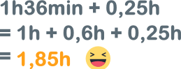 Sachant que 36 minutes sont équivalentes à 0,6 heure, nous en déduisons que 1h36min + 0,25h est égale à 1,85h.