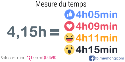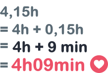 Sachant que 0,15 heure est égale à 9 minutes (0,15 x 60 / 1), nous pouvons convertir 4,15h par 4h09min.